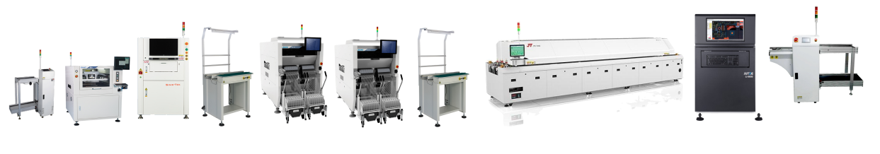 全自動(dòng)上板機(jī)→ 全自動(dòng)印刷機(jī)GKG GSE→思泰克SPI →接駁臺(tái) →RX-7→ RX-7→ 接駁臺(tái)→ 勁拓回流焊→ 矩子在線AOI → 下板機(jī)(從左→ 右)